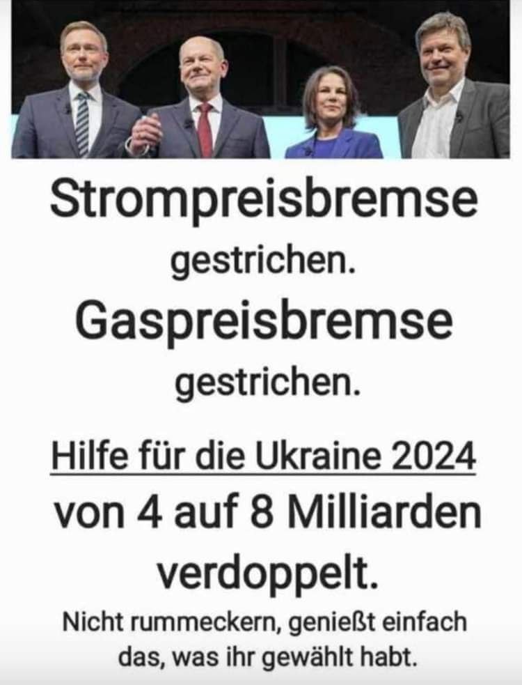 „Scholz bezeichnete es zudem als »fette, dicke Lüge«, dass die Bundesregierung auf russisches Erdgas verzichtet habe. Es sei Russland gewesen, das den Gashahn durch die Nord-Stream-1-Pipeline zugedreht habe. Die folgende Preisexplosion, die staatlich gedeckelten Preise und die Suche nach anderen Gaslieferungen habe Deutschland »weit über 100 Milliarden Euro« gekostet.“