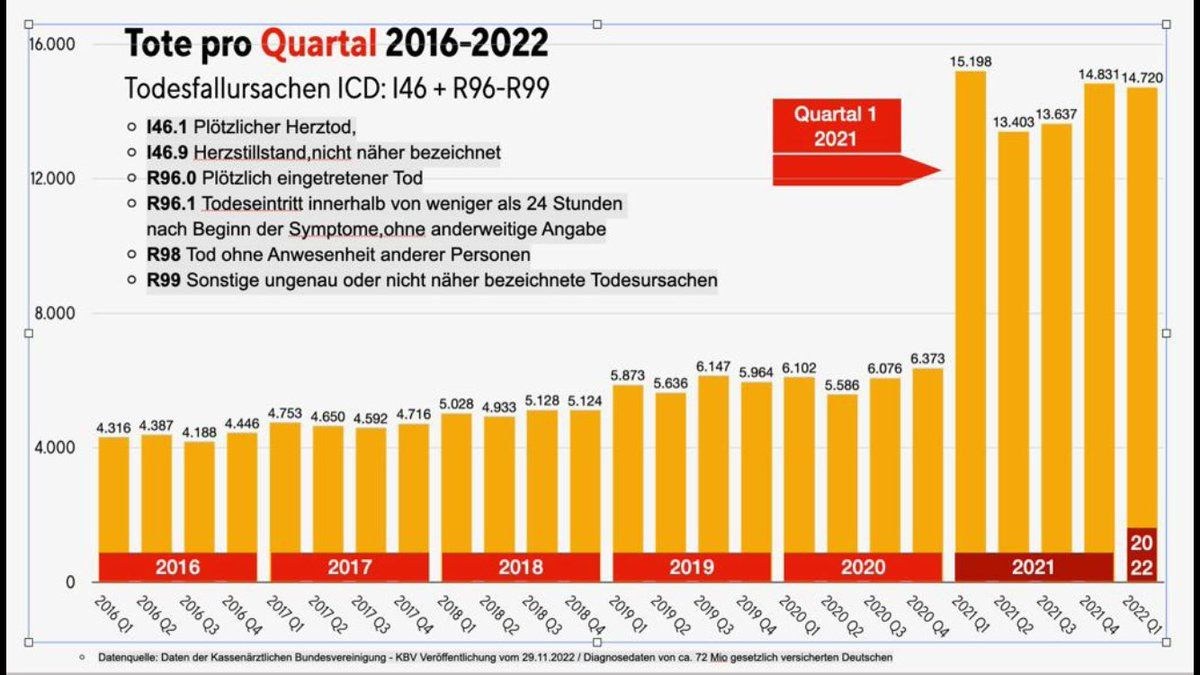 Fakt ist, dass hier ein epochaler Gesundheitsskandal vertuscht werden soll. Und dieser reicht sogar noch viel weiter: Weil nicht nur solche Symptome und Nebenwirkungen unter den weltweit -zig Millionen schädlichen Impffolgen auftreten, die sich zu „Long Covid“ umdichten lassen, sondern eben massenhaft immer mehr Todesfälle – wobei vor allem Herz-Kreislauf-Erkrankungen und Myokarditis vor allem auch bei jüngeren Männern gehören (die „Sekundentote“ von Leistungssportlern lassen grüßen!) -, und weil die Übersterblichkeit steigt und steigt und steigt, was auch Karl Lauterbach nicht leugnen kann: Da bauen Lauterbach und seine Impfschergen auch auf diese Feld vor – und versucht schonmal, alle Herztoten, die zuvor einmal Corona hatten (was – bei derzeit schon fast 40 Millionen bisherigen Infektionen in Deutschland – bald auf jeden zutrifft) als „Corona-Tote“ deklarieren zu lassen. Es ist dasselbe Spiel wie bei „Long Covid“: Die offensichtlichen Folgen einer verbrecherischen Massen-Experimentalimpfung werden der Krankheit in angelastet, vor der die Impfung eigentlich schützen soll.