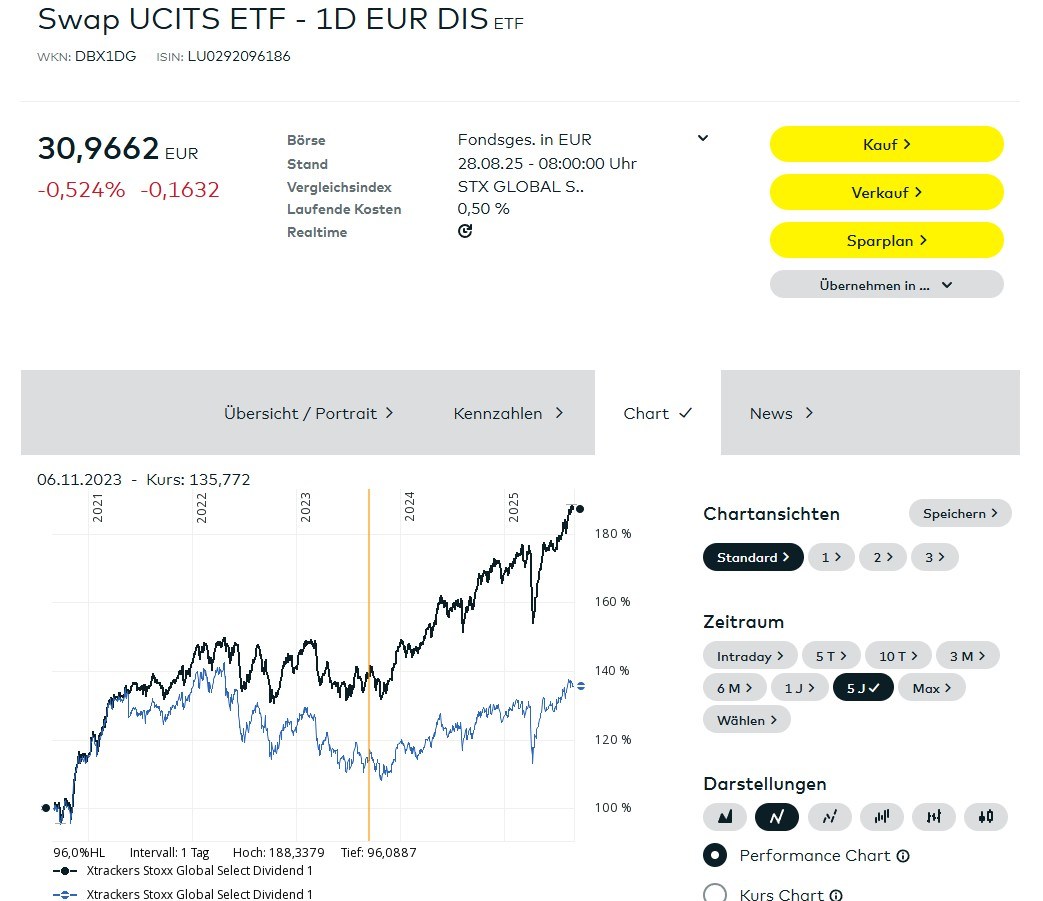 Bei einem Dividenden-ETF wie den DBX1DG macht dies über 5 Jahre einen Unterschied von +84% zu +35% aus: